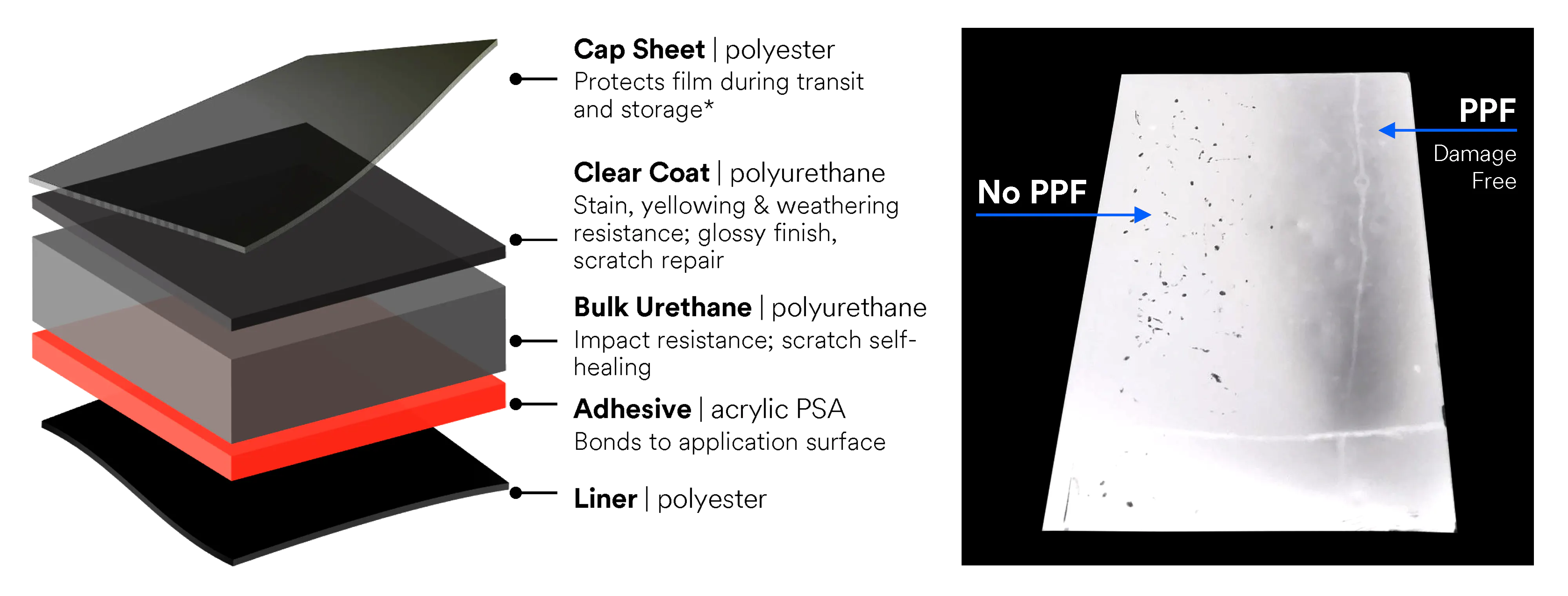 Designed to protect automotive paint and other vulnerable surfaces of the vehicle from stone chips, scratches, bug damage, road tar, stains, automotive fluid stains and punishing outdoor weathering including harsh ultraviolet (UV) radiation.